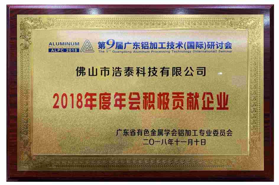 2020年浩泰科技榮獲佛山市鋁加工協(xié)會(huì)頒發(fā)的“積極貢獻(xiàn)獎(jiǎng)”。