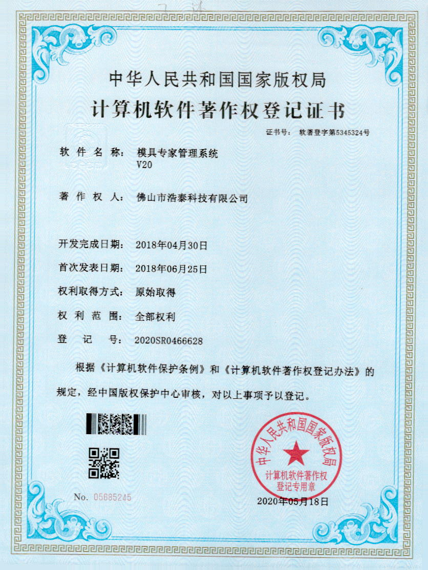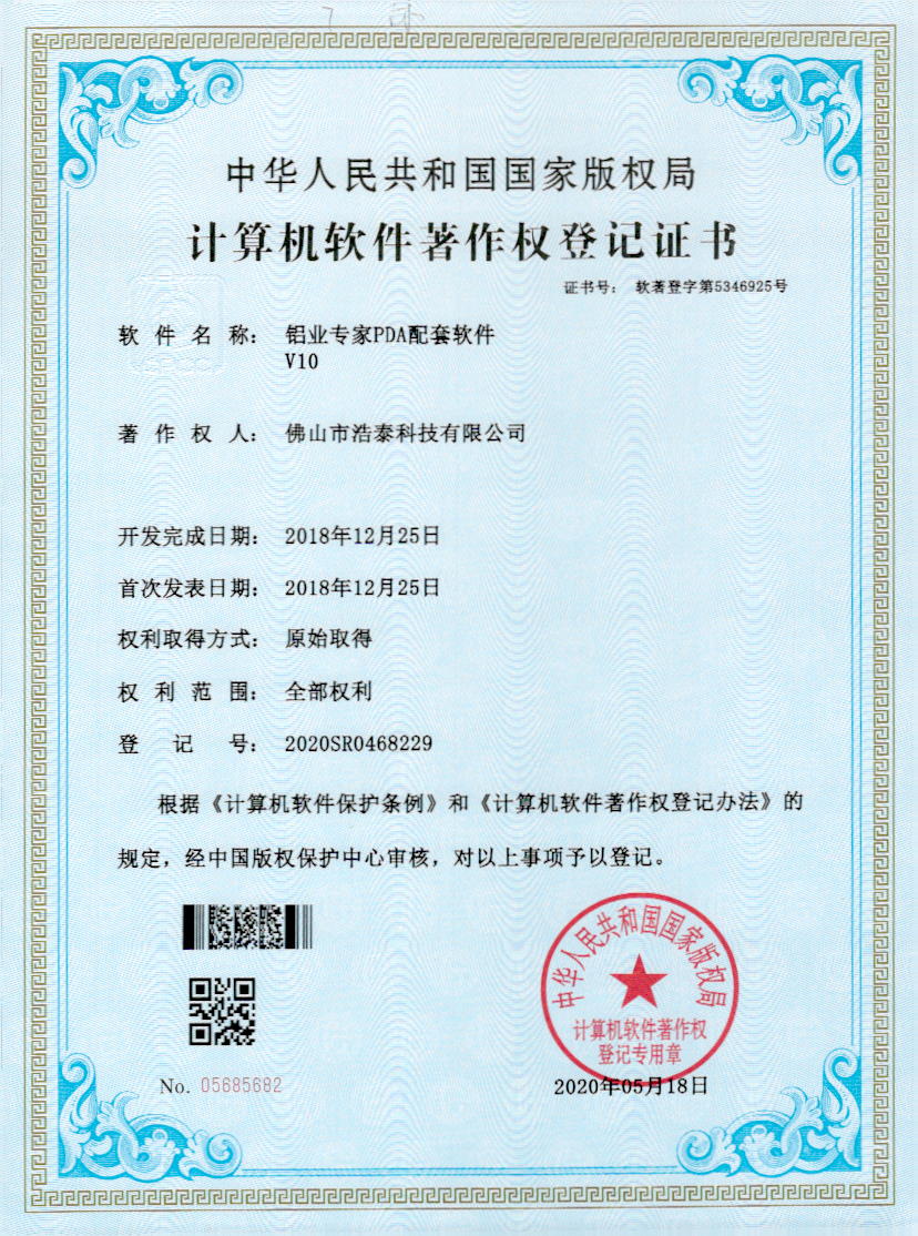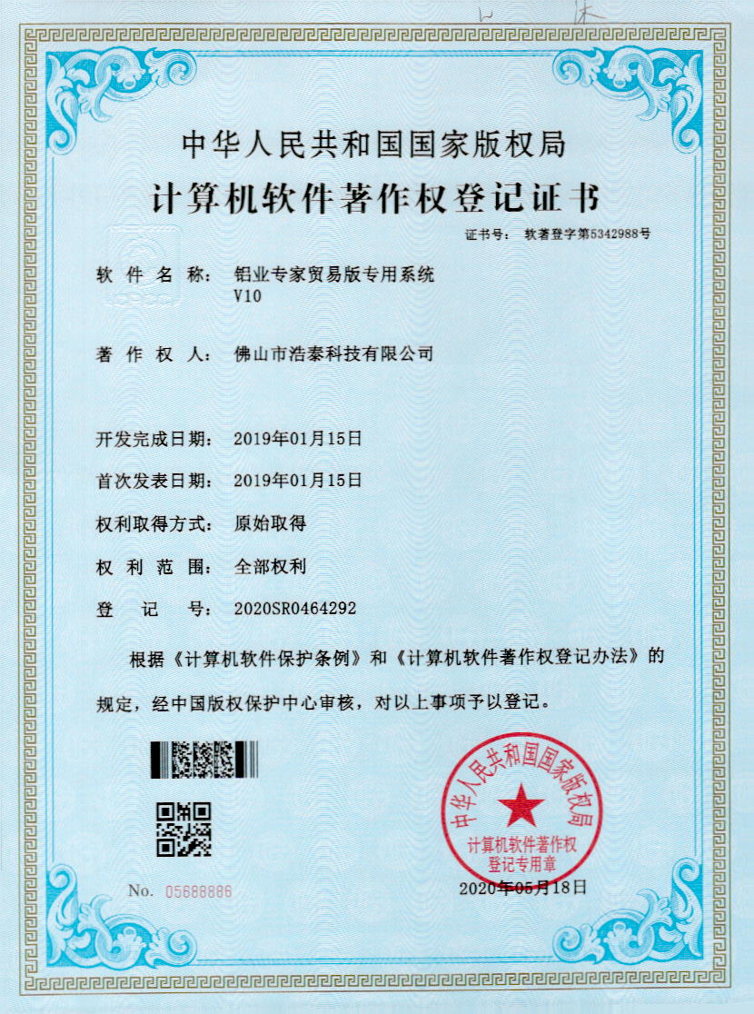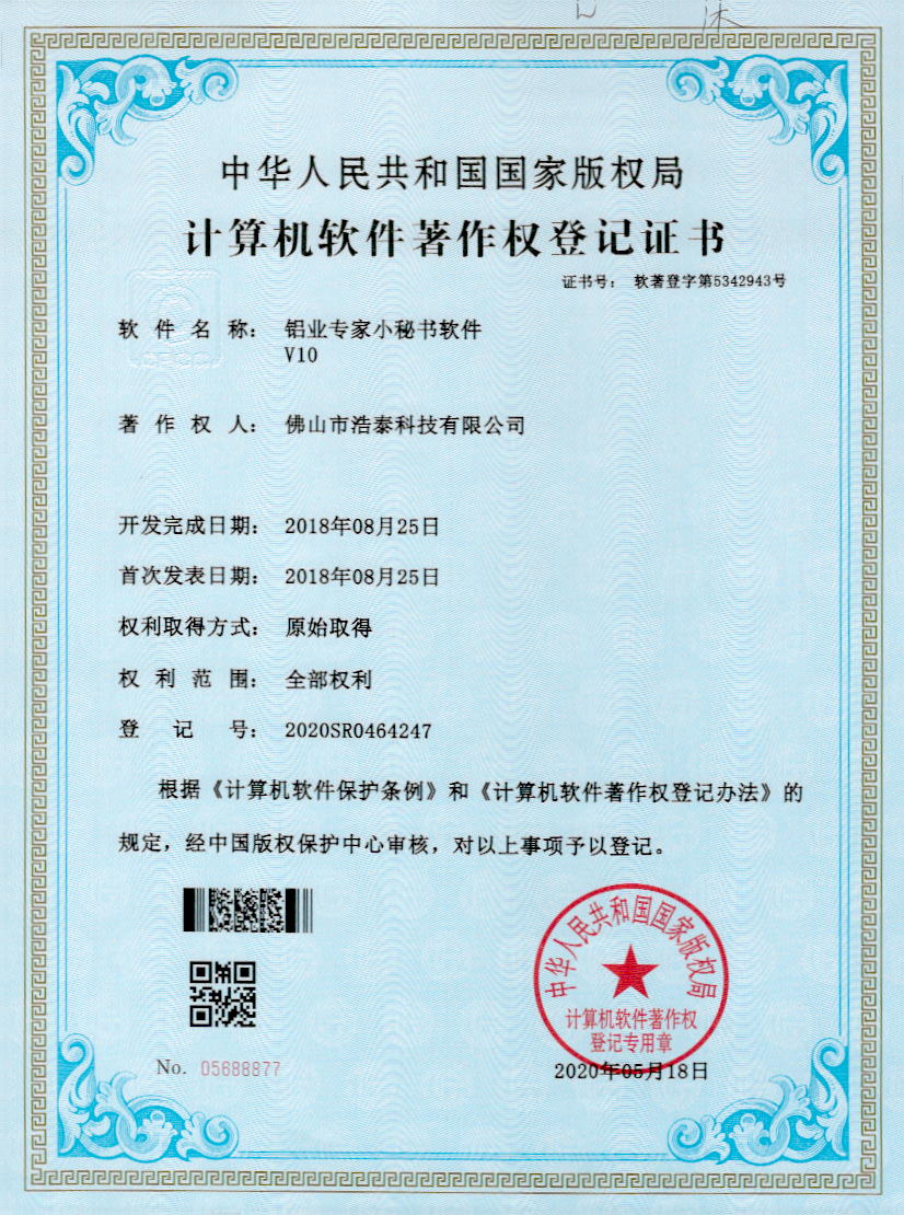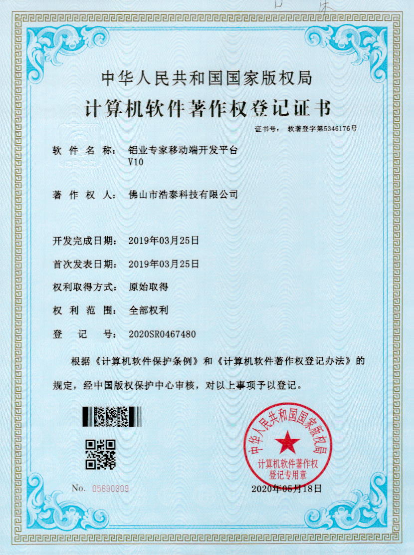 浩泰鋁箔專家系統(tǒng)V1.0,浩泰鋁商家管理軟件V1.0,浩泰鋁模板生產(chǎn)管理系統(tǒng)V1.0,浩泰項(xiàng)目管理系統(tǒng)V1.0,浩泰訂單中心管理軟件V1.0,浩泰鋁業(yè)專家工業(yè)版管理軟件V1.0,浩泰建材租賃信息系統(tǒng)V1.0,浩泰啟航平臺(tái)V2.0,浩泰移動(dòng)辦公中心軟件V1.0,10個(gè)軟件商標(biāo)注冊(cè)成功,鋁業(yè)專家云端ERP上線,同時(shí)我司取得高新技術(shù)企業(yè)榮譽(yù)!