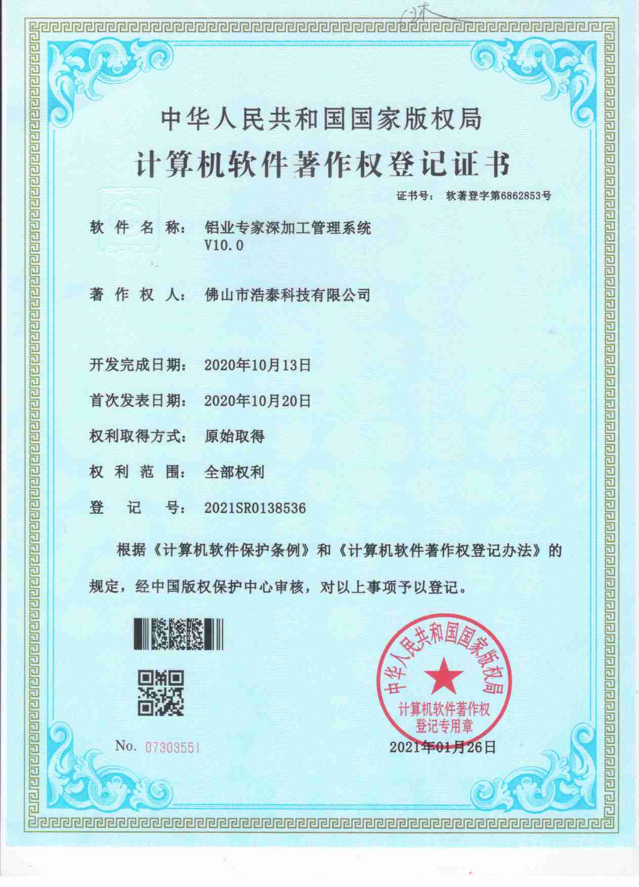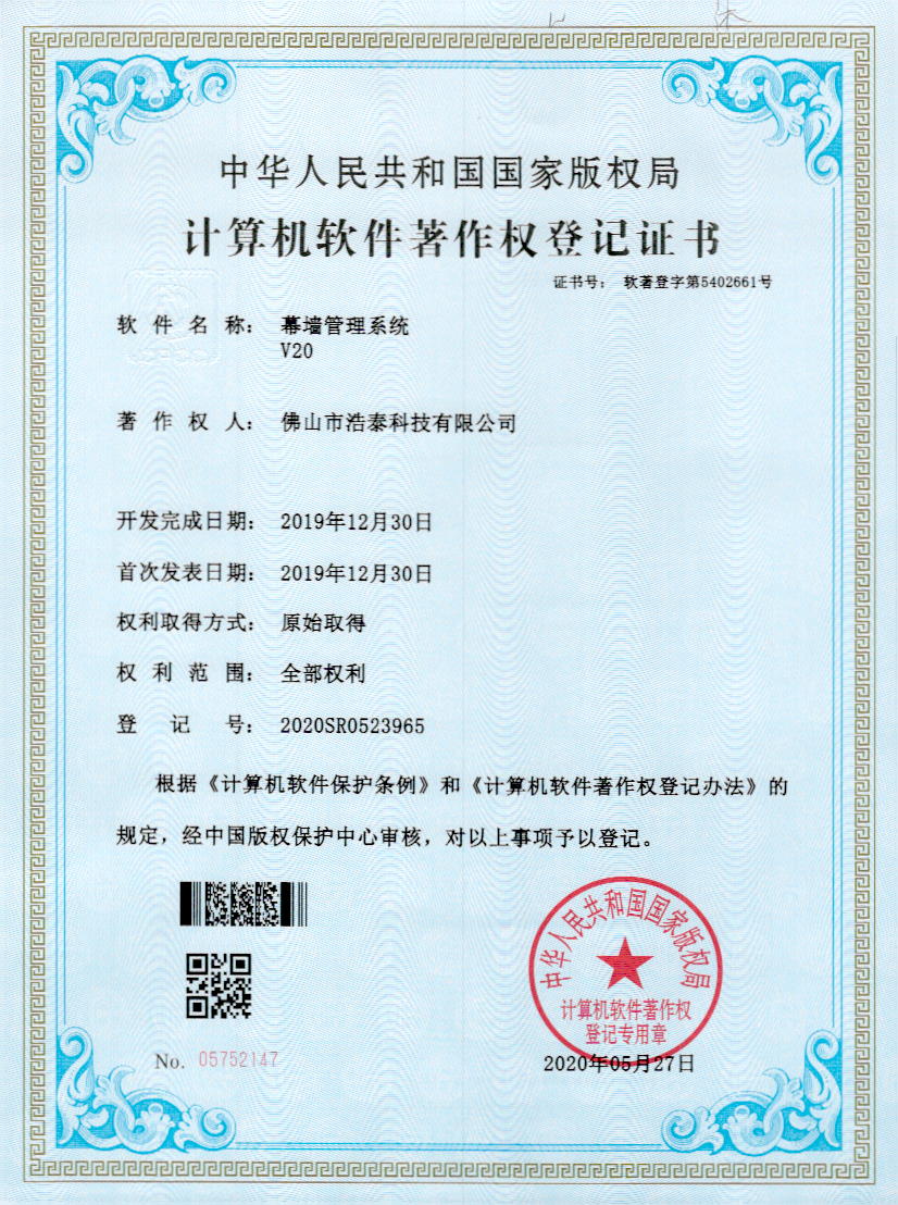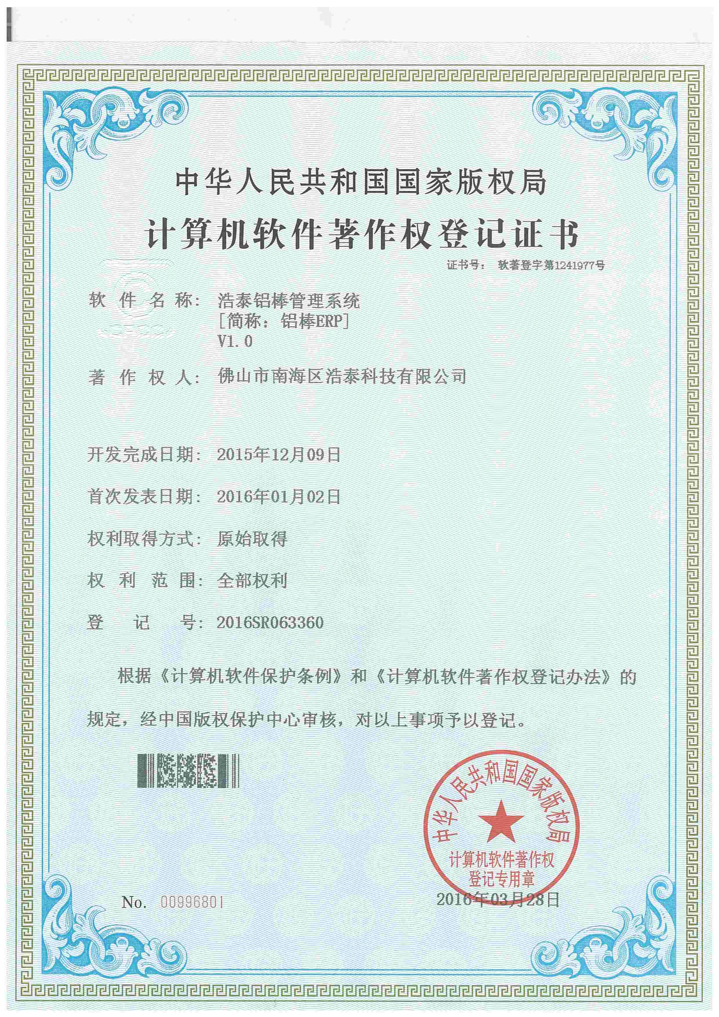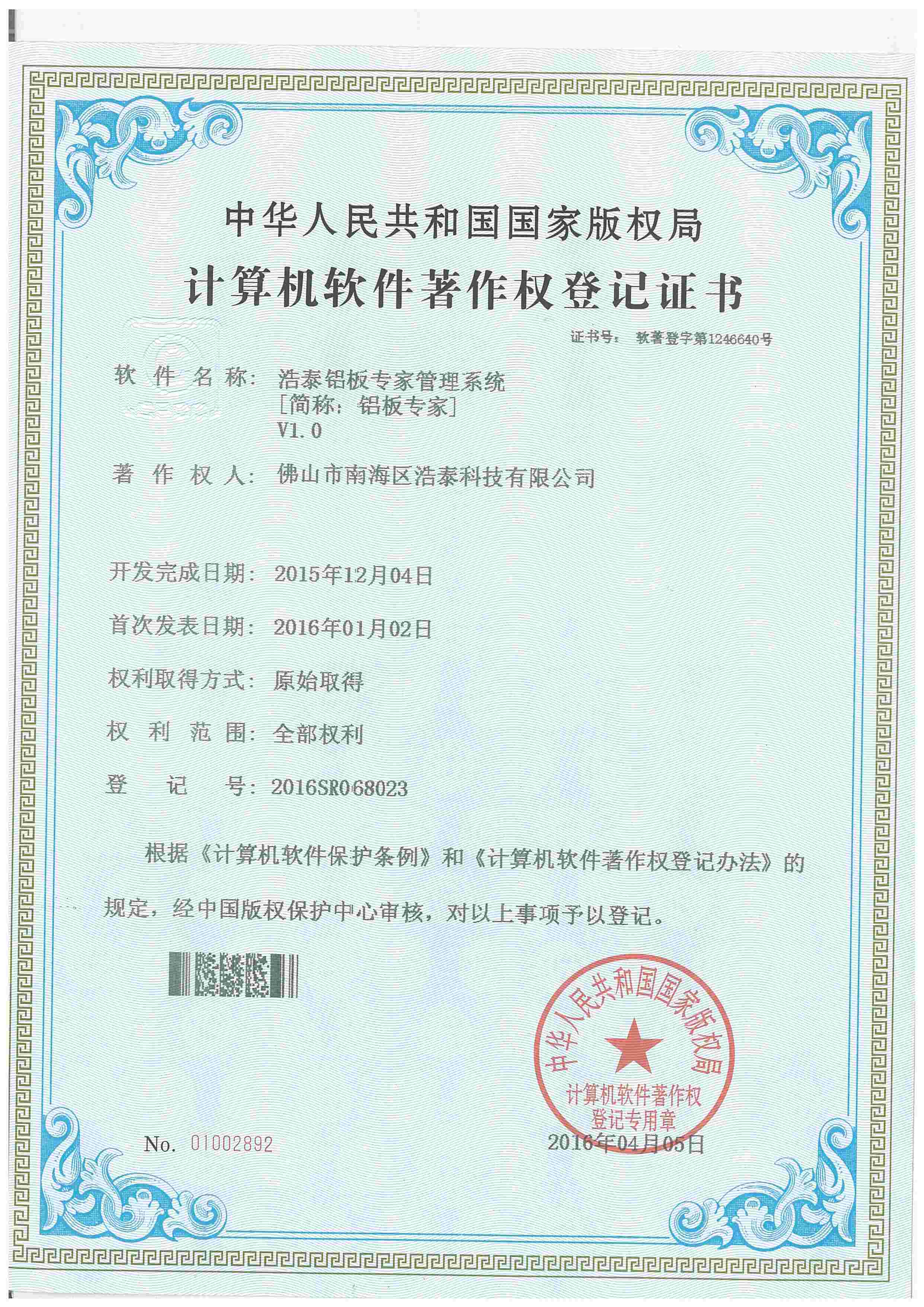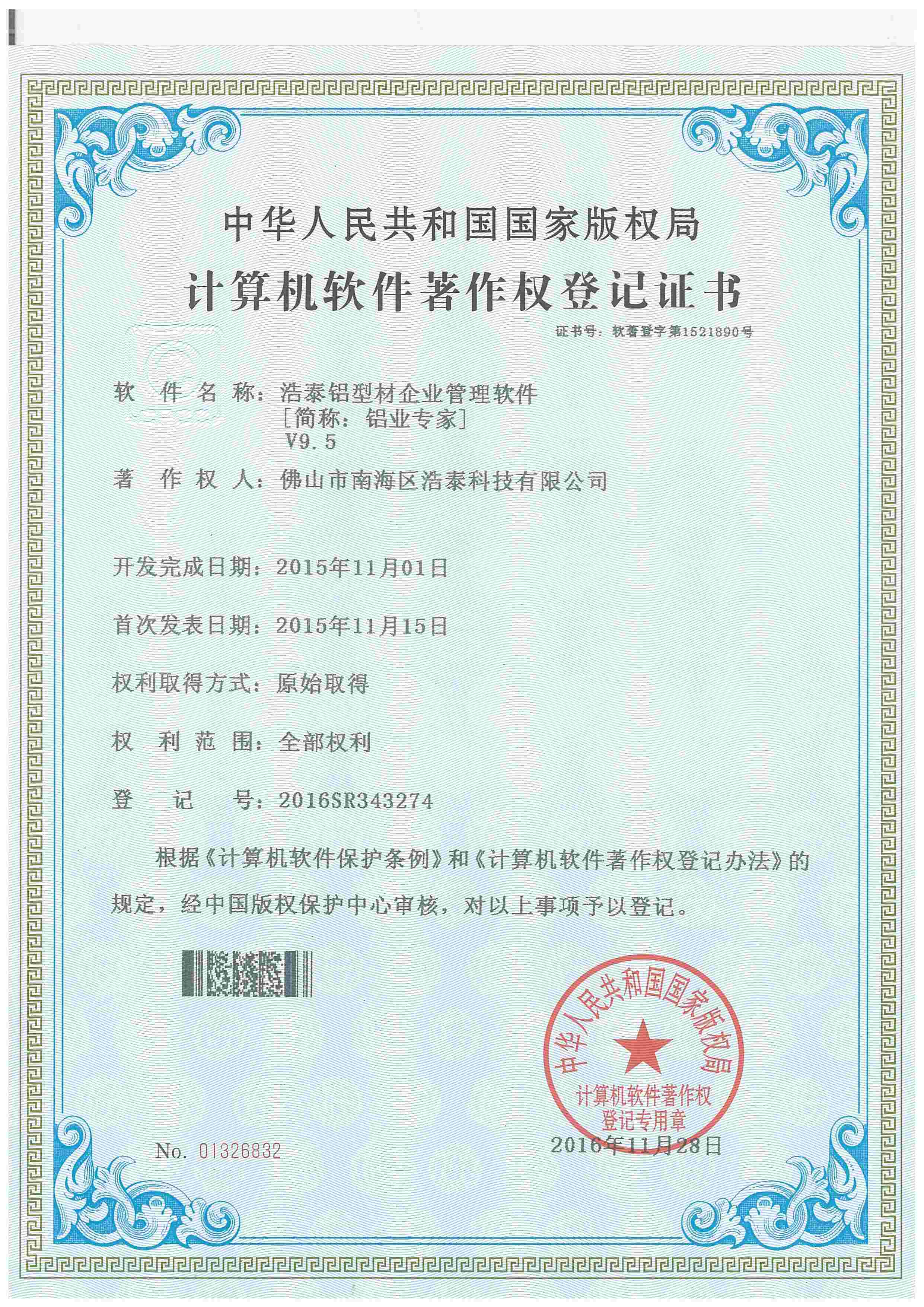 浩泰鋁箔專家系統(tǒng)V1.0,浩泰鋁商家管理軟件V1.0,浩泰鋁模板生產(chǎn)管理系統(tǒng)V1.0,浩泰項(xiàng)目管理系統(tǒng)V1.0,浩泰訂單中心管理軟件V1.0,浩泰鋁業(yè)專家工業(yè)版管理軟件V1.0,浩泰建材租賃信息系統(tǒng)V1.0,浩泰啟航平臺(tái)V2.0,浩泰移動(dòng)辦公中心軟件V1.0,10個(gè)軟件商標(biāo)注冊(cè)成功,鋁業(yè)專家云端ERP上線,同時(shí)我司取得高新技術(shù)企業(yè)榮譽(yù)!