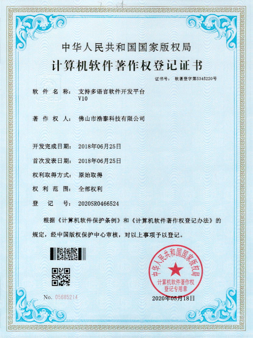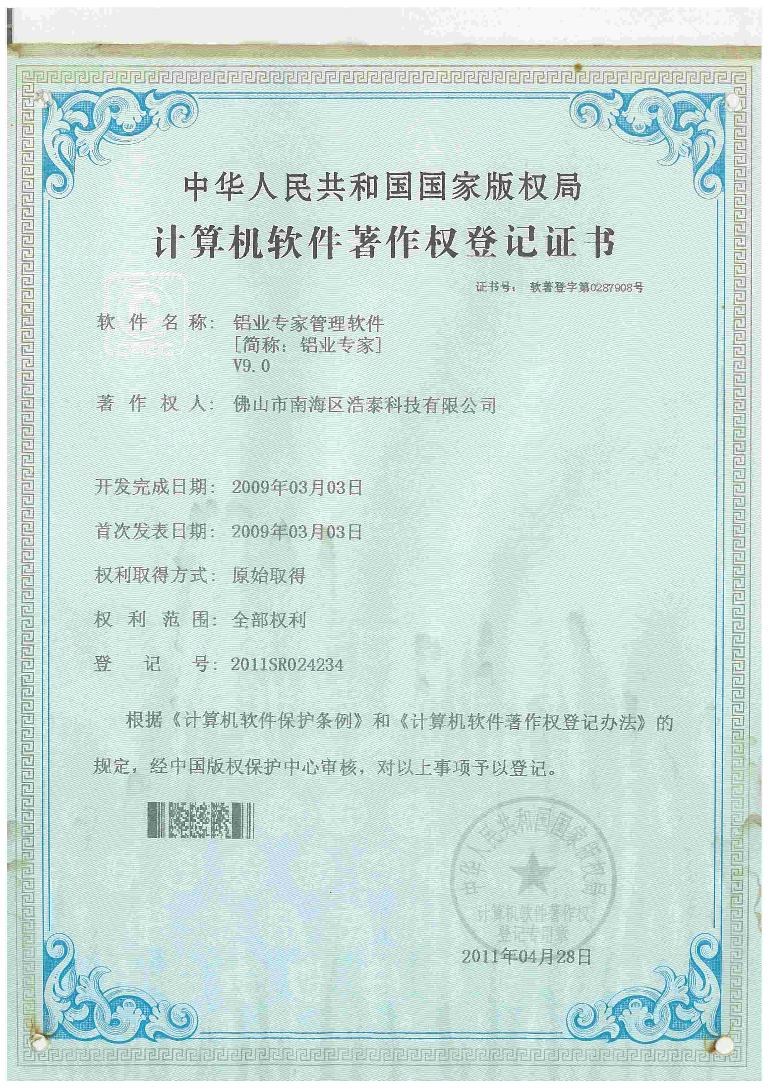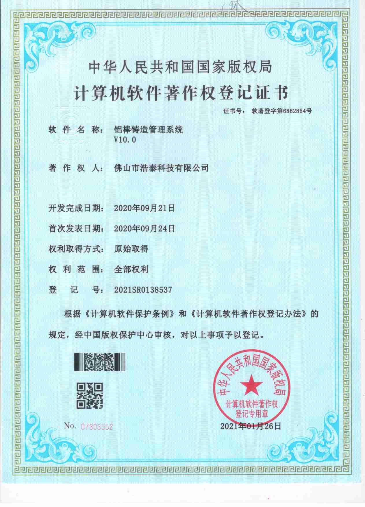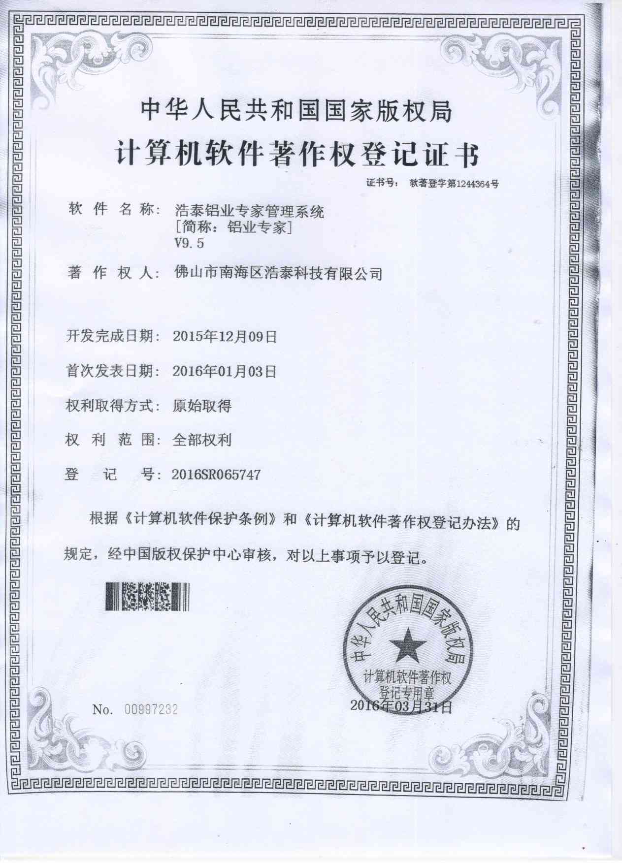 浩泰鋁箔專家系統(tǒng)V1.0,浩泰鋁商家管理軟件V1.0,浩泰鋁模板生產(chǎn)管理系統(tǒng)V1.0,浩泰項(xiàng)目管理系統(tǒng)V1.0,浩泰訂單中心管理軟件V1.0,浩泰鋁業(yè)專家工業(yè)版管理軟件V1.0,浩泰建材租賃信息系統(tǒng)V1.0,浩泰啟航平臺(tái)V2.0,浩泰移動(dòng)辦公中心軟件V1.0,10個(gè)軟件商標(biāo)注冊(cè)成功,鋁業(yè)專家云端ERP上線,同時(shí)我司取得高新技術(shù)企業(yè)榮譽(yù)!